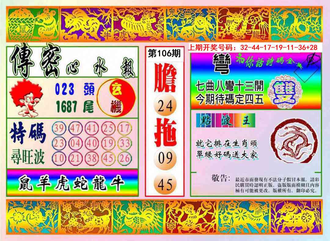 106期:【五福马神】♠【②肖④码】核准出售 |